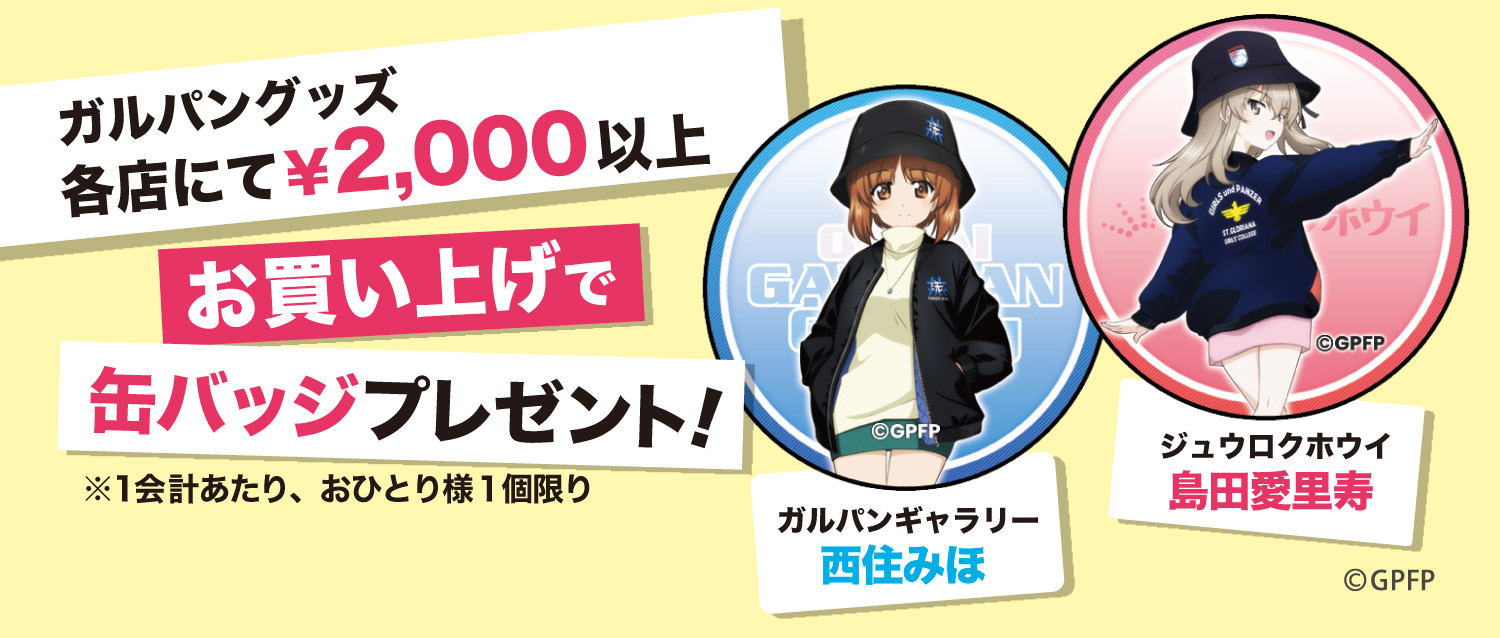 各店にてガルパングッズ2,000円以上お買い上げで缶バッジをプレゼント!今年の缶バッジはみほ(ギャラリー)と愛里寿(ジュウロクホウイ)!