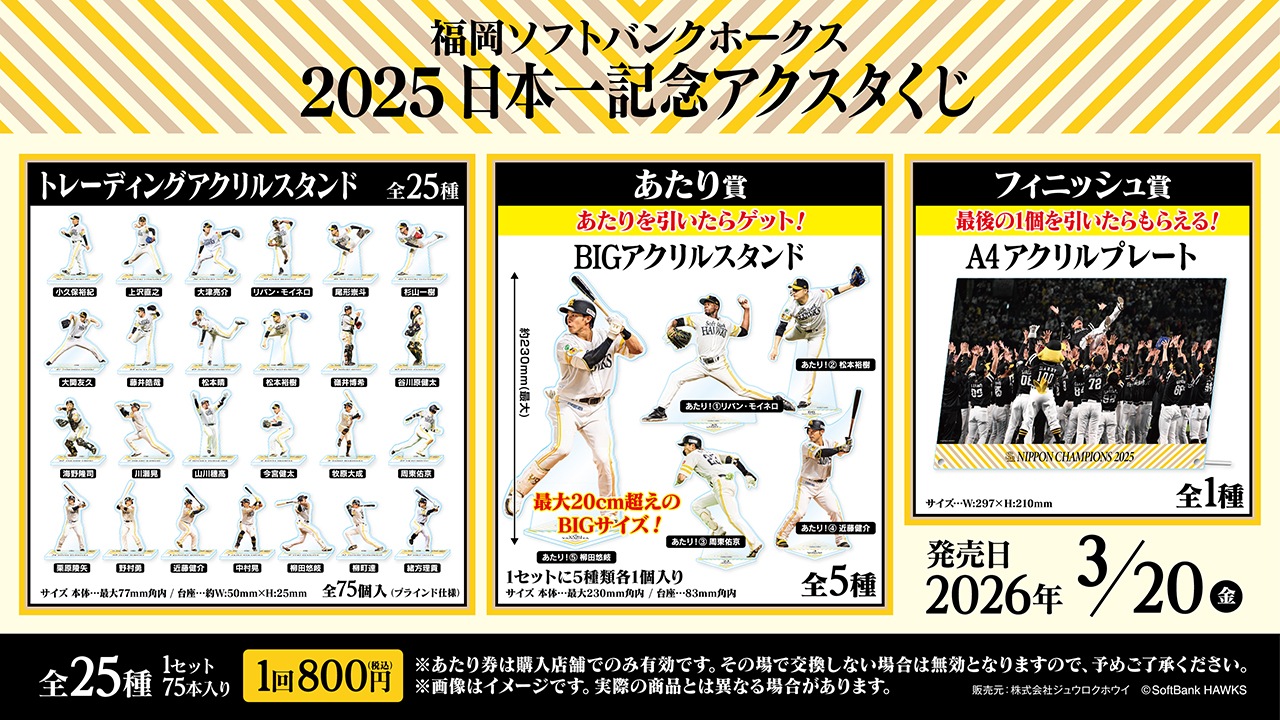 株式会社ジュウロクホウイ(本社:東京都千代田区、代表取締役:赤松 武雄)は、福岡ソフトバンクホークス株式会社監修のもと、5年ぶり12度目の日本一を記念した「福岡ソフトバンクホークス 2025日本一記念アクスタくじ」を、2026シーズン開幕戦(3月27日(金) H-F 18時30分試合開始)の1週間前となる、2026年3月20日(金)に発売することを決定いたしましたのでお知らせいたします。販売は九州エリアを中心とした全国の書店などにて店頭販売となります。2025年に日本一を果たし誇りを胸に2026シーズンを戦う福岡ソフトバンクホークスの選手たちのアクリルスタンドが当たるアクスタくじを是非この機会にお買い求めください。